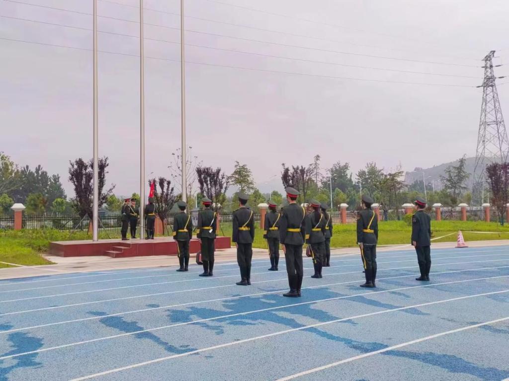 随后,国旗护卫队迈着整齐划一、铿锵有力的步伐,护送着五星红旗正步走来,全体师生庄严肃立,注视着五星红旗冉冉升起,表达对祖国的崇高敬意。