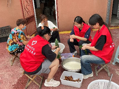 包完粽子,团队成员与老人们共同回忆端午节传统节日的风俗,协助托老院组织老人们开展小型游戏活动,帮助托老院打扫环境卫生、分发节日食品,在浓浓的节日氛围中陪伴老人们欢度端午佳节。