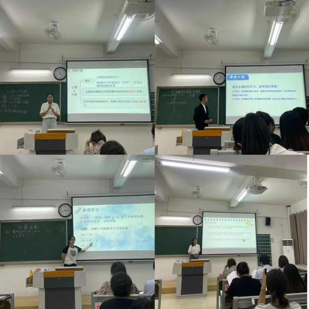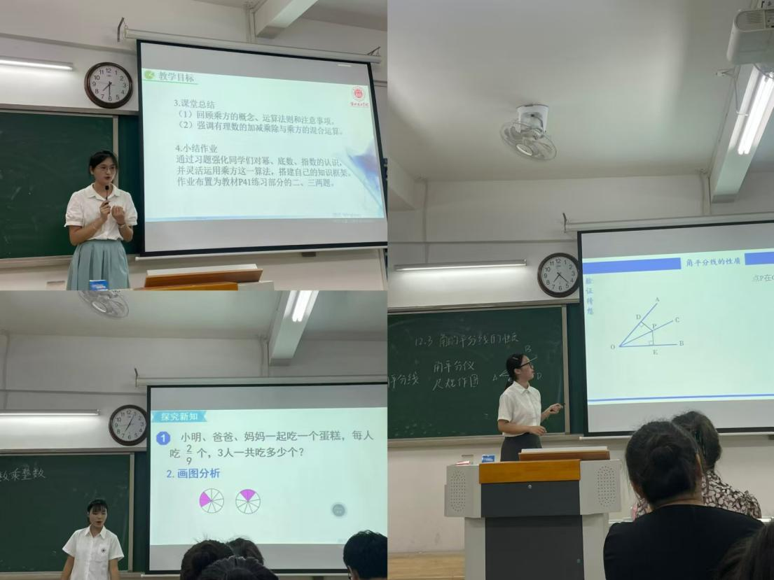 此次师范生技能大赛分为初赛和决赛两个阶段。近40名学生参与中小学数学组比赛,经过初赛的激烈角逐,最终8名选手脱颖而出,齐聚决赛现场,其中小学组2名,中学组6名。本次决赛采用5分钟说课和10分钟模拟课堂授课相结合的考核方式。在本次比赛中,选手们活用师范技能,用实际行动展现了数学学子风采。他(她)们合理设计课程结构,巧妙运用数学原理,以生动的语言、形象的演示、精美的课件、工整的板书和有趣的教学案例向评委老师们充分展现了数学学科的独特魅力,让现场观众仿佛置身于一场场精彩的数学探险之旅。最后,评委团对所有学生进行综合打分,评选出一等奖1名、二等奖2名共3名学生参加省级比赛!