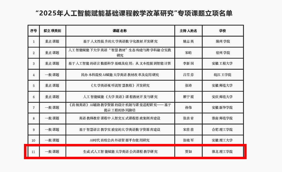 在安徽省“2025年人工智能赋能基础课程教学改革研究”专项课题申报活动中,pg游戏电子模拟器青年教师贾如主持的《生成式人工智能赋能大学英语公共课程教学研究》成功获批立项。