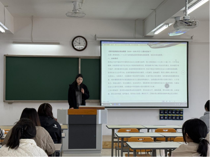 为深入贯彻党的二十大关于加快建设教育强国的战略部署,3月19日中午,pg游戏电子模拟器汉语言文学专业学生第一、第二党支部在2教323教室联合开展主题党课活动,组织支部党员共同研读《教育强国建设规划纲要(2024-2035年)》,领悟其精神要义。