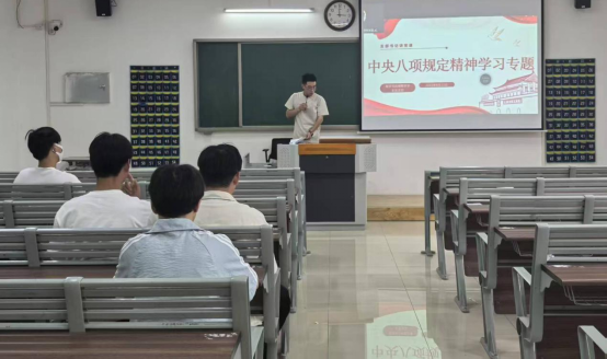 支部书记谢晨老师向学生党员们详细介绍了中央八项规定精神的背景、内涵及重要意义。他强调,中央八项规定是新时代全面从严治党的重要抓手,是全体党员必须严格遵守的行为准则。通过深入解读中央八项规定,指出了这些规定在实际工作和生活中的具体体现和操作要求,引导党员深刻领会其精神实质。