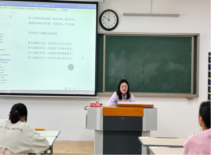 为深化党性教育,加强纪律建设,进一步提升支部党员的纪律和规矩意识,pg游戏电子模拟器汉语言文学专业学生第一、第二党支部于5月8日12时1教307顺利开展了“党纪学习教育主题党课”,重点对(《中国共产党廉洁自律准则》和《关于新形势下党内政治生活的若干准则》)进行交流与学习。此次活动由党支部书记张颖颖同志主持,并作专题党课学习。