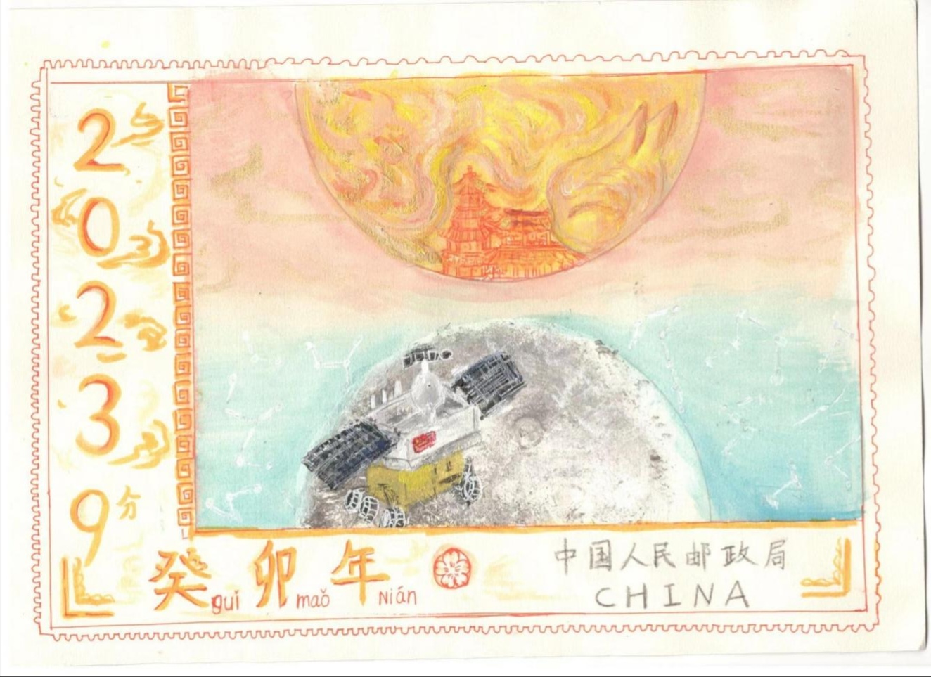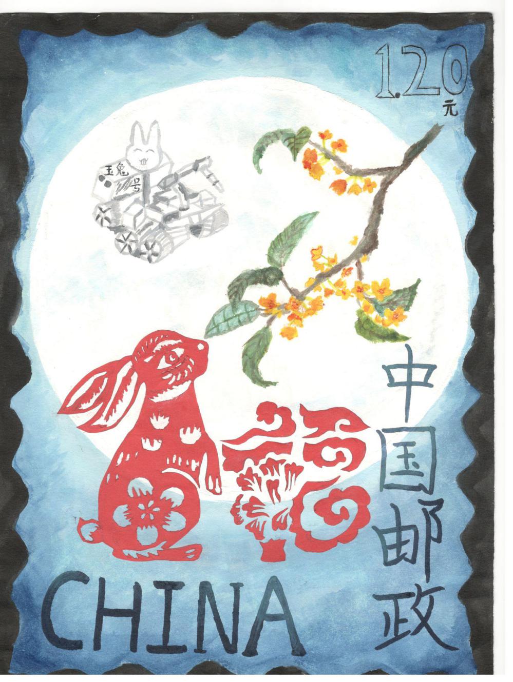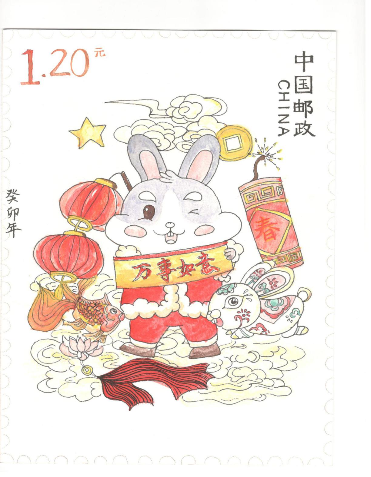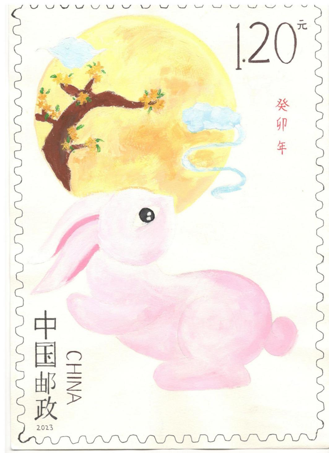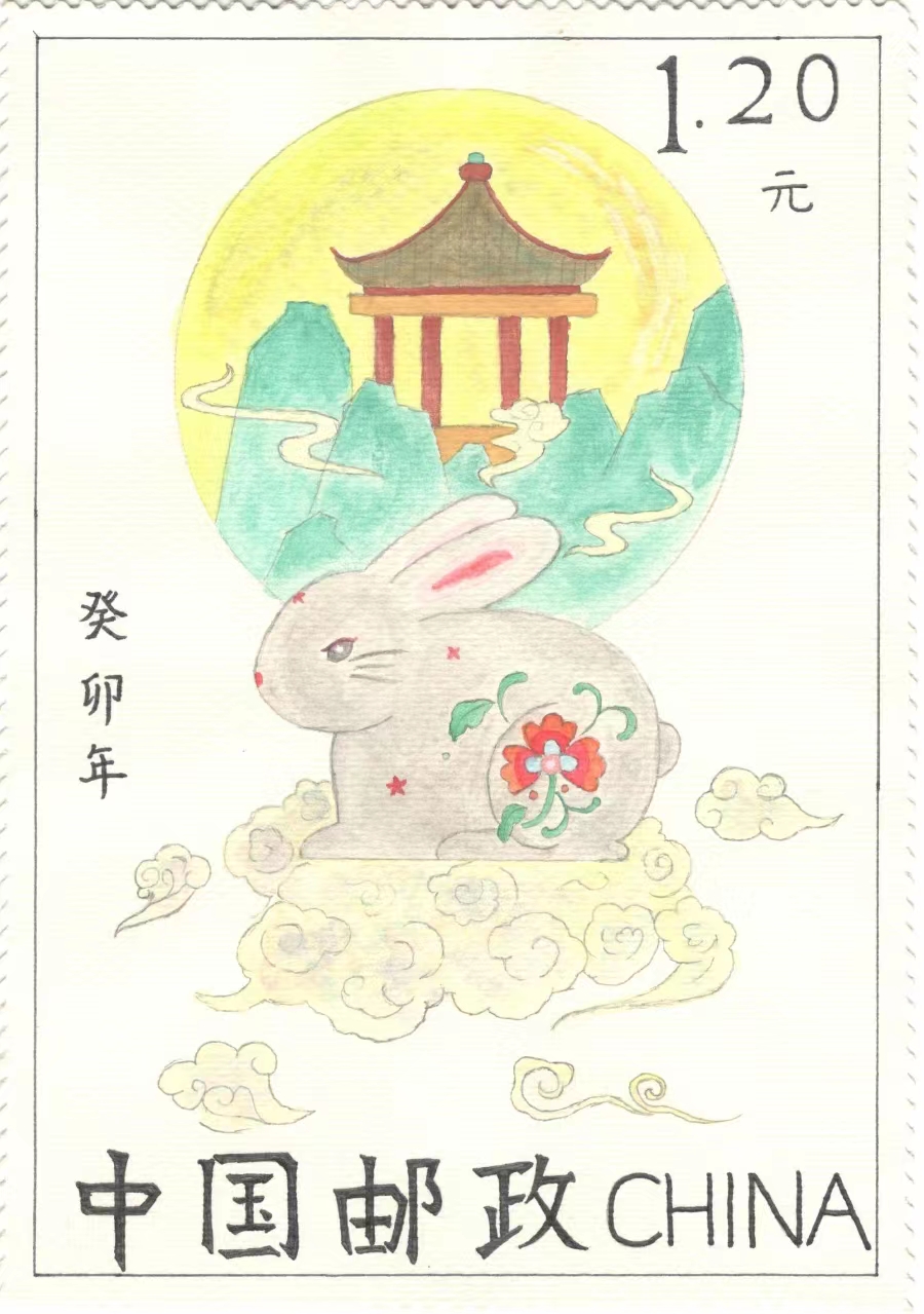 介绍:为了迎接是癸卯年,我设计了该邮票。邮票名为《双兔送福图》。一只是红色剪纸兔子,在月光下轻嗅桂香,有意展现中国传统神话中的玉兔和桂树。一只是玉兔号,中国首辆月球车,富有时代气息。迎春当然少不了福,于是运用中国剪纸制作了祥云福字,再加上齿孔,面值,铭记,就构成了这张邮票。