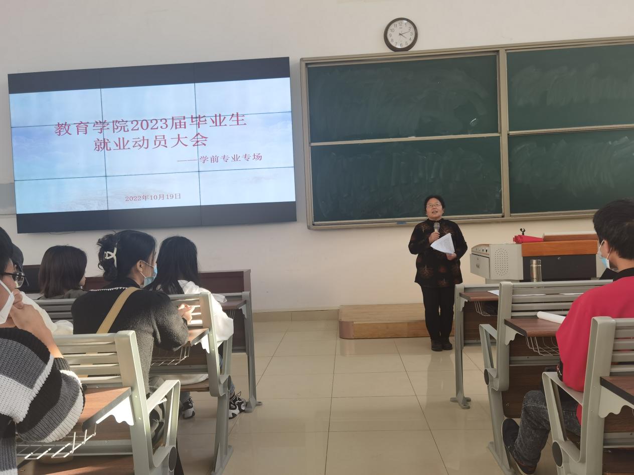 2022年10月19日下午,pg游戏官网在教学楼121教室召开2023届毕业生就业动员大会。为帮助2023届毕业生准确有效地确定就业方向,尽快地让同学们在思想、行动上早做准备,指导毕业生如何走好从大学走向社会的重要一步。pg游戏电子模拟器王家云院长、孟向红副书记及学前教研组老师出席本次会议,2023届pg游戏电子模拟器学前教育专业全体毕业生参加会议。会议分两场进行,分别由pg游戏电子模拟器学前教育专业辅导员任若晨、侯莉萍主持。