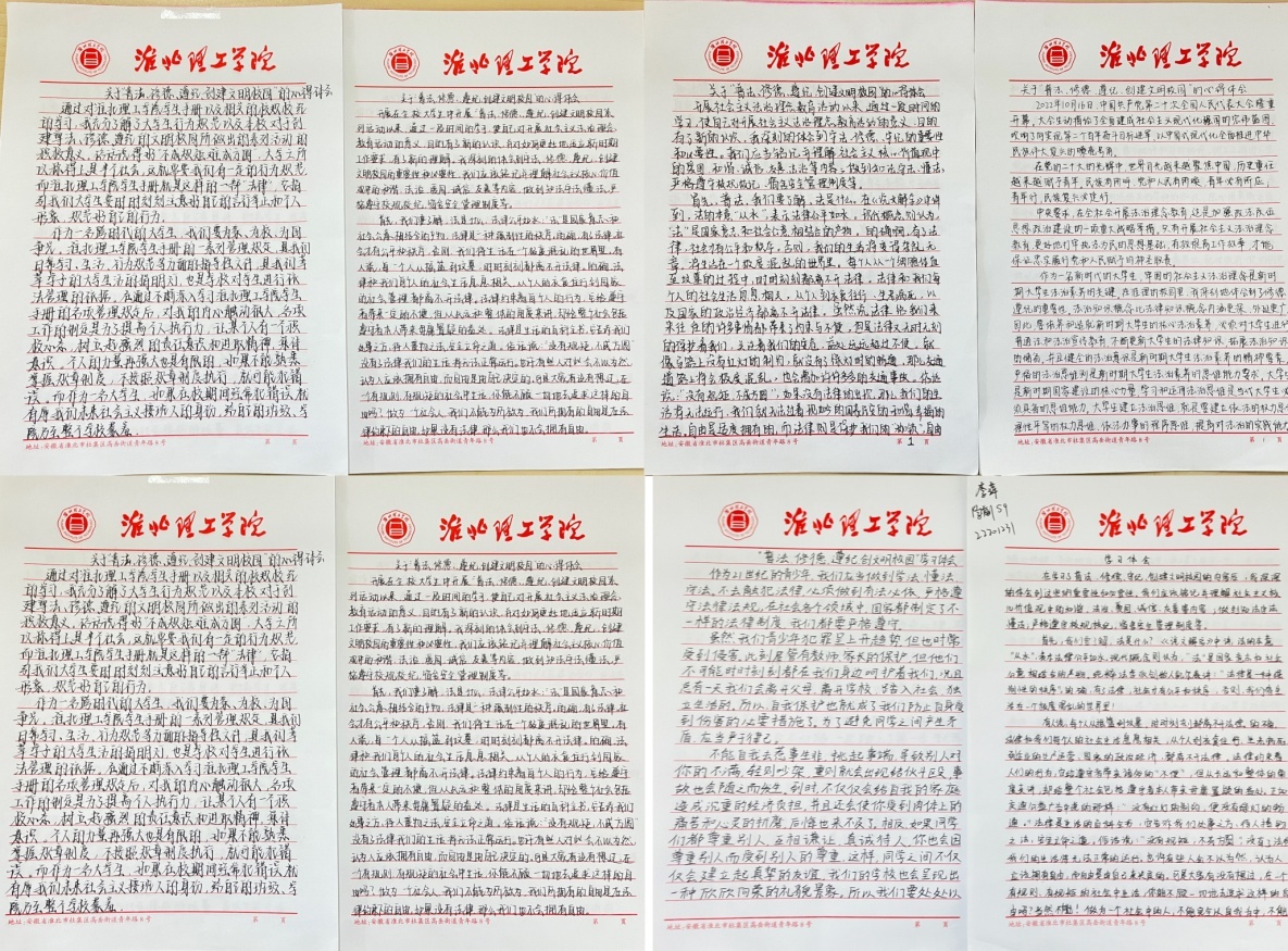 为树立当代大学生知礼守法,讲文明树新风的青春风貌,10月下旬,pg游戏电子模拟器要求全体学生认真手写一份不少于1000字的心得体会,并就主题做出承诺书。同学们用肃穆的文字,庄重的承诺,表示定会将法治精神落实到日常事务之中,活动成效显著。