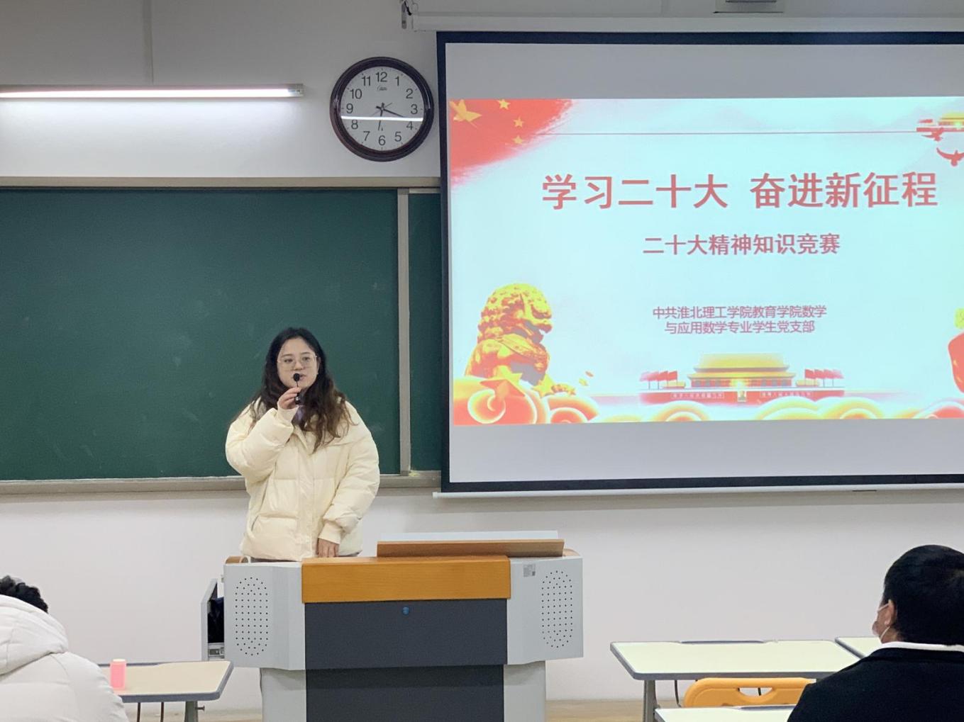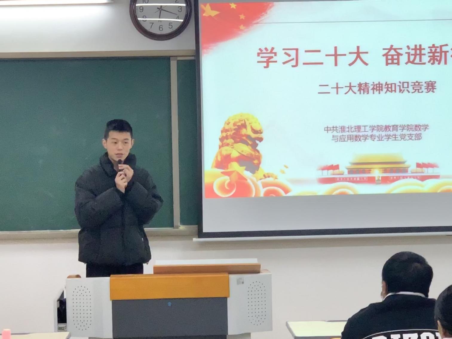 为深入学习宣传贯彻党的二十大精神,回顾党的光辉历史,推动党的二十大精神落地生根、入脑入心。pg游戏电子模拟器数学与应用数学学生党支部积极部署,于12月1日在1教313开展“学习党的二十大精神知识竞赛活动”,活动由支部委员孙虎主持,支部书记陈媛媛、全体支部党员及入党积极分子参加了活动。