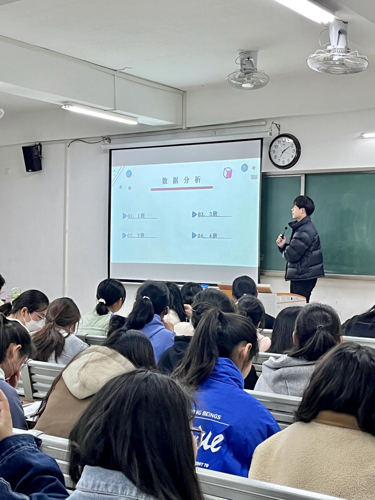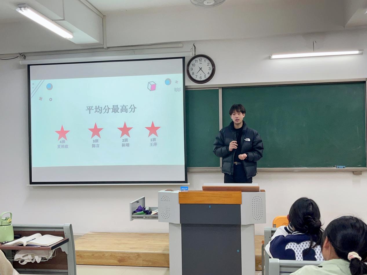 随后,郭鸿鑫老师对四个班的成绩进行综合比较,鼓励四个班的同学们在下学期的学习进程中进行良性竞争,反思自身的不足之处,并表扬各班成绩的第一名,希望同学们可以再接再厉,再创佳绩。