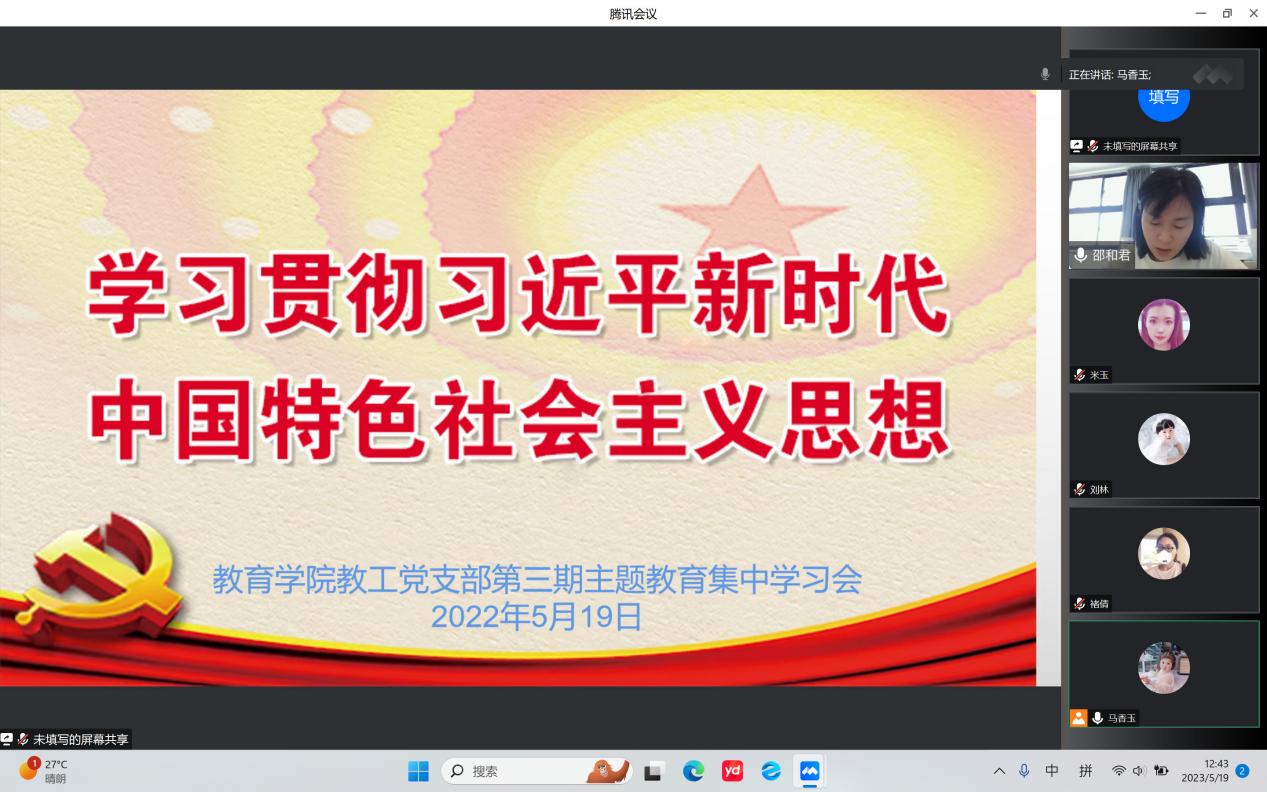 5月19日下午,pg游戏电子模拟器学习贯彻习近平新时代中国特色社会主义思想主题教育开展第三期读书班党课学习,本次学习会以“线上课堂”形式举行,由教工党支部委员邵和君同志主持并领学。