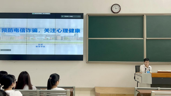 辅导员孙虎老师以“预防电信诈骗,关注心理健康”为主题给同学们讲授预防电信诈骗、关注心理健康教育。