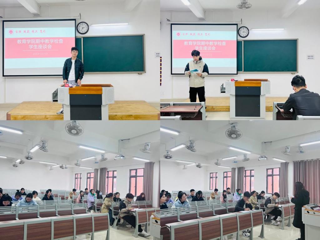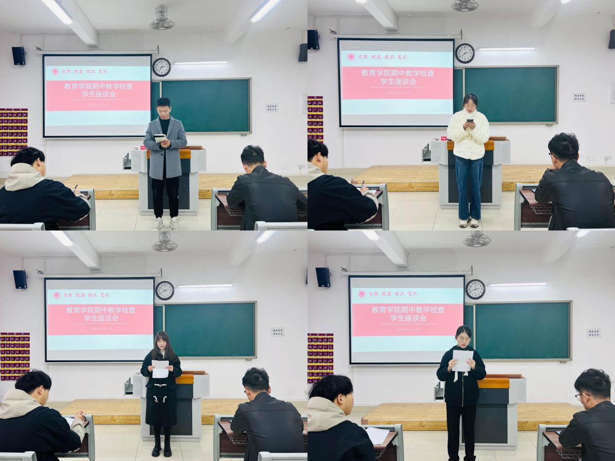 会议开始,主持会议老师介绍了期中教学检查学生座谈会是为了充分了解和掌握课堂教学信息动态,加强教与学的沟通,发挥学生在教学管理工作中的积极作用,提高课堂教学质量和教学管理服务水平,希望同学们结合本学期教学过程中的感受提出意见和建议。