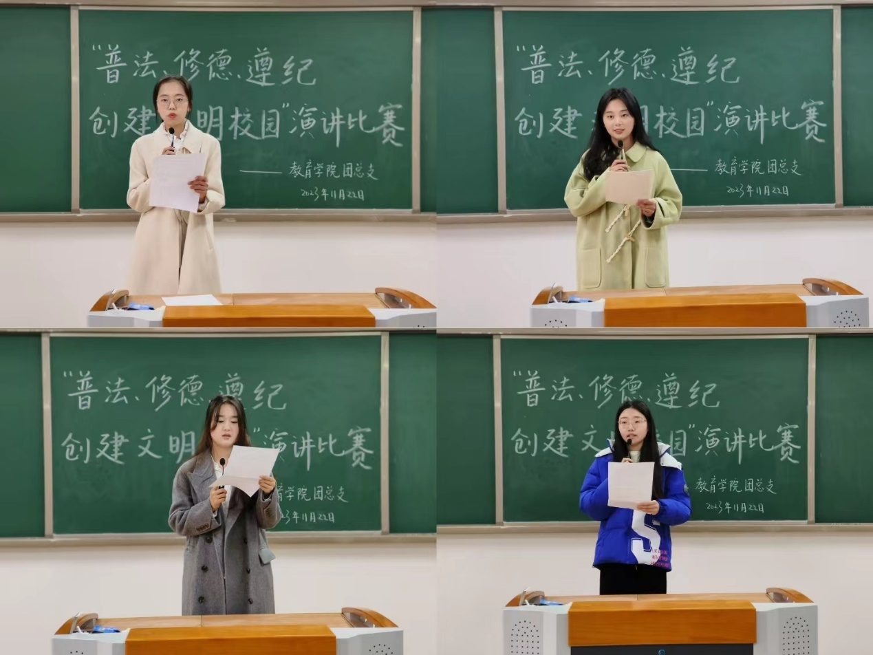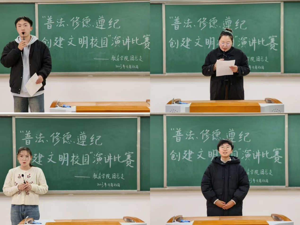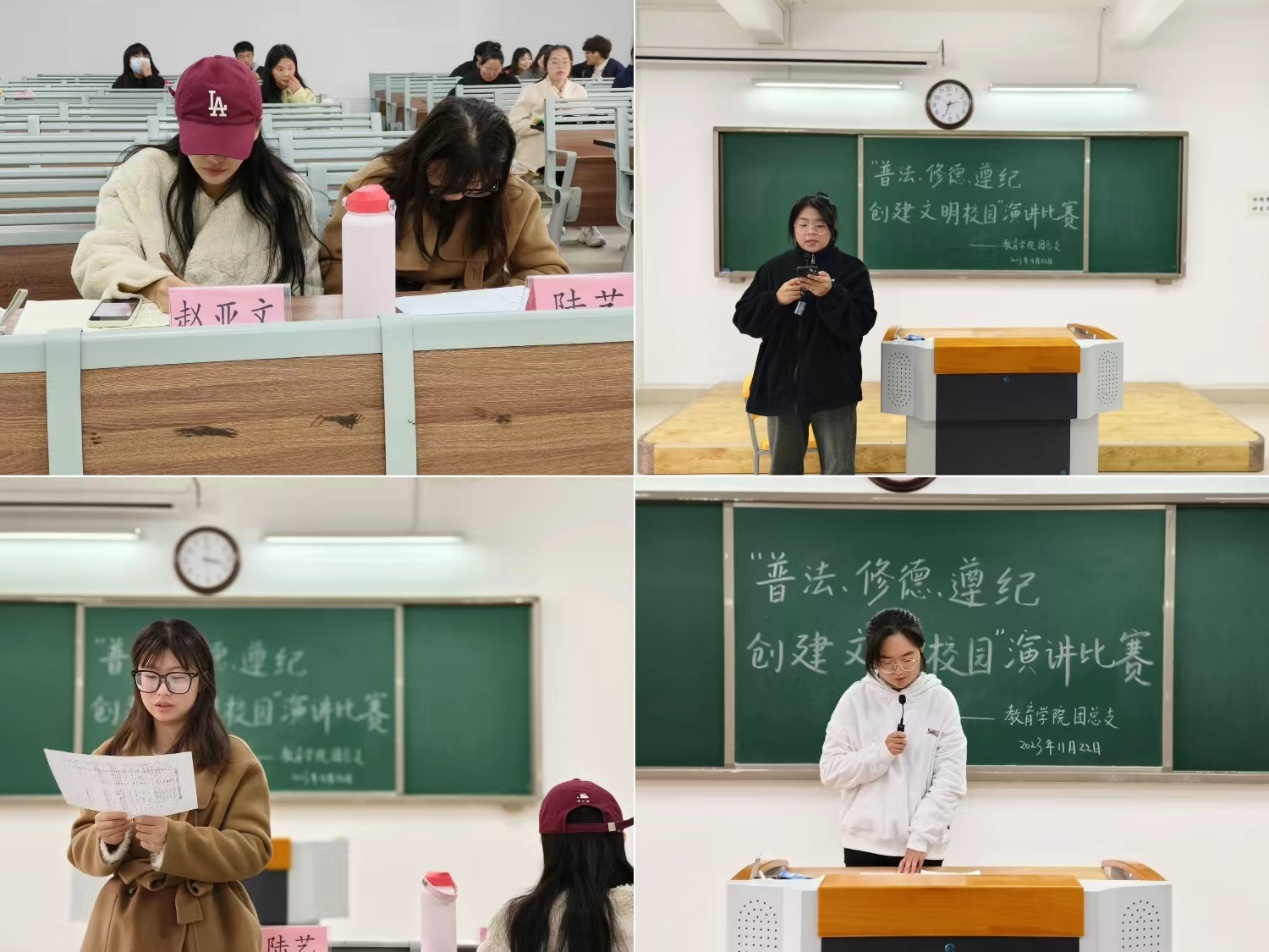 为落实学校《关于开展2023年“普法、修德、遵纪,创建文明校园”专项活动的通知》精神,提高同学们的法律意识,大力弘扬法治精神,创建学风校风优良的文明校园,pg游戏电子模拟器于11月22日下午在2号教学楼412、413、414、415、416教室分别开展以“普法、修德、遵纪,创建文明校园”为主题的演讲比赛。学院2023级辅导员老师担任评委。