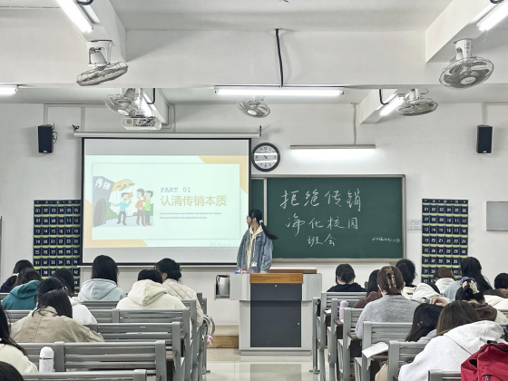 活动以班级为单位组织召开防范传销主题班会,班干部讲解传销相关知识并组织学生观看防范传销的PPT,开展班级讨论,让学生分享自己对传销的认识和看法,以及身边可能存在的传销风险。
