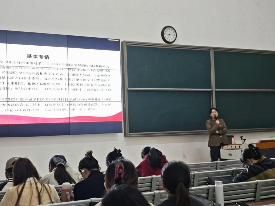 在选岗指导环节,郑凌双老师倾囊相授。她不仅全面介绍了各类岗位的特点、职责和发展前景,还结合同学们的专业背景、兴趣爱好以及个人优势,提供了极具针对性的选岗建议。为了让同学们更直观地理解,她还列举了许多成功选岗的案例进行分析,使同学们深刻认识到合理选岗对于未来职业发展的重要性。最后,郑凌双老师为同学们详细介绍了公务员考试的日程安排和面试流程,为同学们积极备考打下基础。