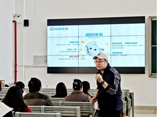 会议开始,胡金保老师先用亲身经历向同学们论述了选择和抓住机遇的重要性,了解同学们的工作和生活诉求,鼓励并引导大家要敢想、敢闯、敢拼,努力实现自己的梦想,就同学们关心的薪资水平、福利保障和职业发展空间进行了深入交流,吸引同学们加入锐思教育大家庭。