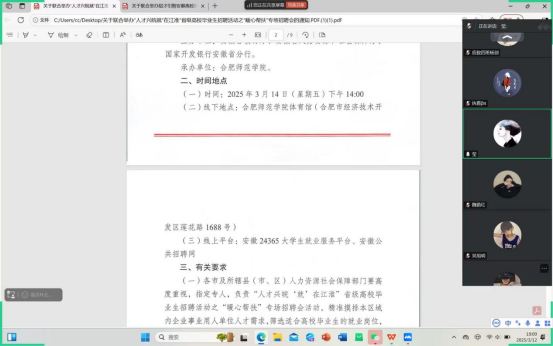 为拓宽就业渠道,学院组织全体2025届毕业班辅导员召开线上就业推进会,重点宣传安徽省“人才兴皖 就‘在江淮’”高校毕业生招聘活动之“暖心帮扶”专场招聘会(合肥师范学院专场)及“招才引智安徽高校行”皖北地区专场招聘会等优质资源。辅导员通过班级群、就业信息平台等渠道精准推送岗位信息,指导学生完善简历、筛选匹配岗位,并建立“岗位推荐-投递跟踪-反馈优化”闭环服务机制,确保人岗匹配精准高效。